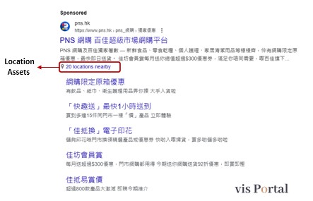 當用戶搜尋您的品牌或相關產品/服務時,地點素材資源 (Location Assets) 能顯示商店地址,將網上潛在客戶引導到實體店,實現從線上到線下的轉化。